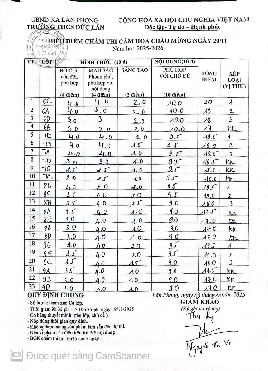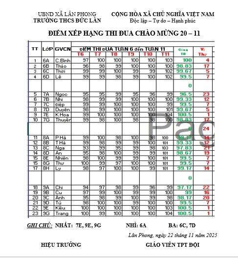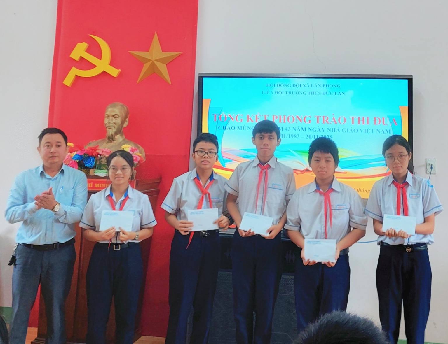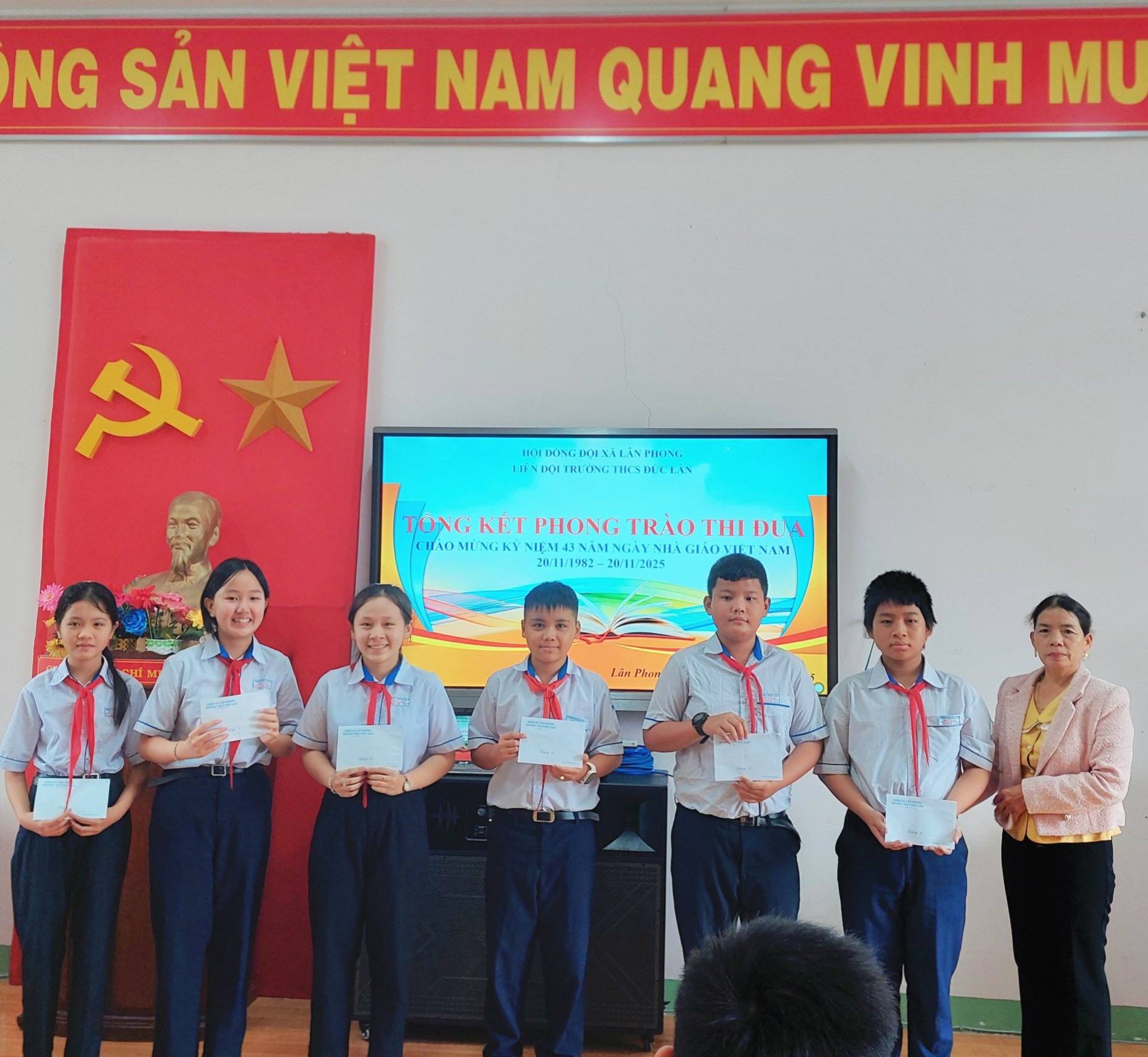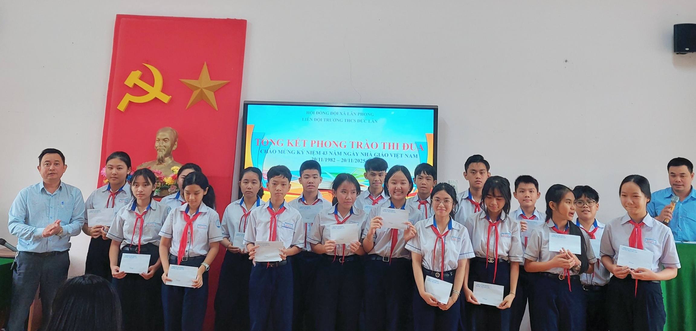SÁNG NGÀY 24/11/2025 – TRƯỜNG THCS ĐỨC LÂN TRAO THƯỞNG CÁC TẬP THỂ VÀ HỌC SINH XUẤT SẮC 🌼 Hòa trong không khí thi đua lập thành tích chào mừng Ngày Nhà giáo Việt Nam 20/11, sáng nay trường THCS Đức Lân đã long trọng tổ chức lễ trao thưởng cho các lớp và các em học sinh đạt thành tích nổi bật trong đợt thi đua tuần 6–11 và vòng hoa điểm 10. 🏆 Kết quả thi đua khối lớp: 🥇 Giải Nhất: 7E, 9E, 9G 🥈 Giải Nhì: 6A 🥉 Giải Ba: 6C, 7D 🌟 Khen thưởng học sinh đạt nhiều điểm 10: Nhiều em đã nỗ lực không ngừng, mang về từ 3 đến 5 điểm 10 ở các môn học khác nhau. Tiêu biểu như: • Bùi Quang Thiên (9E) – 5 điểm 10 • Trần Thị Diễm My (9E), Đinh Việt Phú (9E), Trang Mỹ Linh (9G), Nguyễn Hoàng Phát (6A) – 4 điểm 10 Cùng rất nhiều em học sinh khác đạt thành tích cao trong học tập và rèn luyện. 🎉 Buổi trao thưởng không chỉ ghi nhận sự cố gắng của các em, mà còn lan tỏa tinh thần học tập tích cực trong toàn trường. Xin chúc mừng các tập thể lớp và tất cả các em học sinh được biểu dương hôm nay! Chúc các em tiếp tục giữ vững phong độ, tự tin – chủ động – sáng tạo trong hành trình học tập sắp tới.